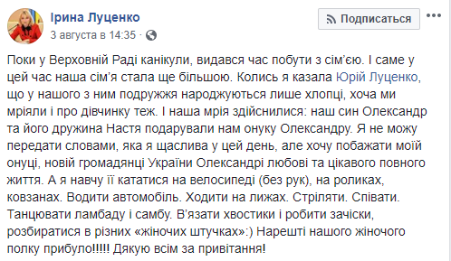 Она написала, что во время каникул в Верховной Раде можно побыть с семьей. И что осуществилась ее мечта - в семье появилась девочка ( у Юрия Луценко два сына - Прим.Ред.), которую она научит разным женским штучкам.