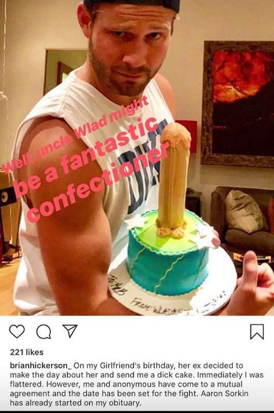 В подписи под фото Хикерсон уточнил: "На день рождения моей девушки (Хейден Панеттьери. – Прим. ред.) ее бывший решил вспомнить о ней и прислал мне торт в виде члена. Я был польщен. Однако я вместе с анонимом пришли к обоюдному согласию и назначили дату для боя. Аарон Соркин (известный в США сценарист. – Прим. ред.) уже начал работу над моим некрологом".