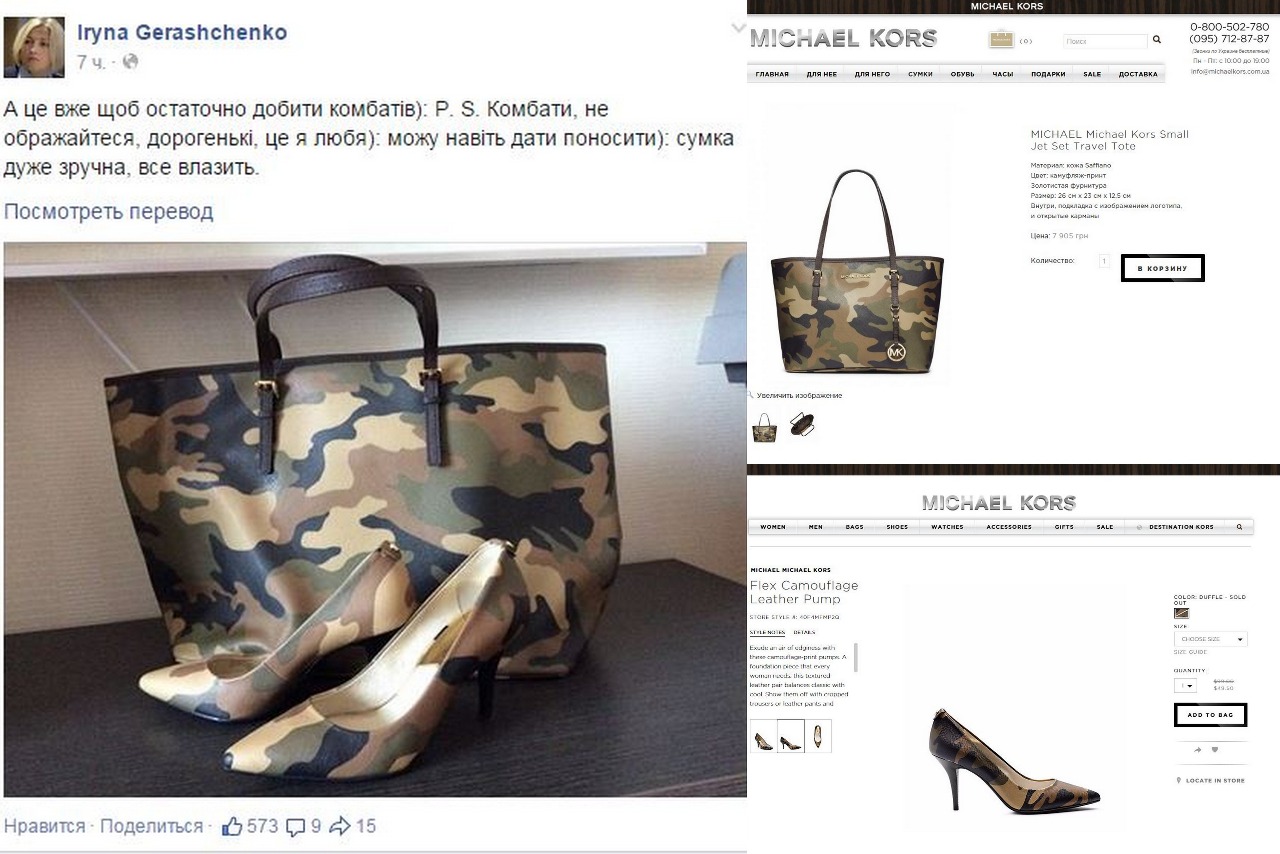 К слову, это пара обуви и сумочка от американского бренда Michael Kors. На то время (2015 год) - сумка Геращенко стоила 7905 грн, а туфли - $99 (по скидке - $49,5).