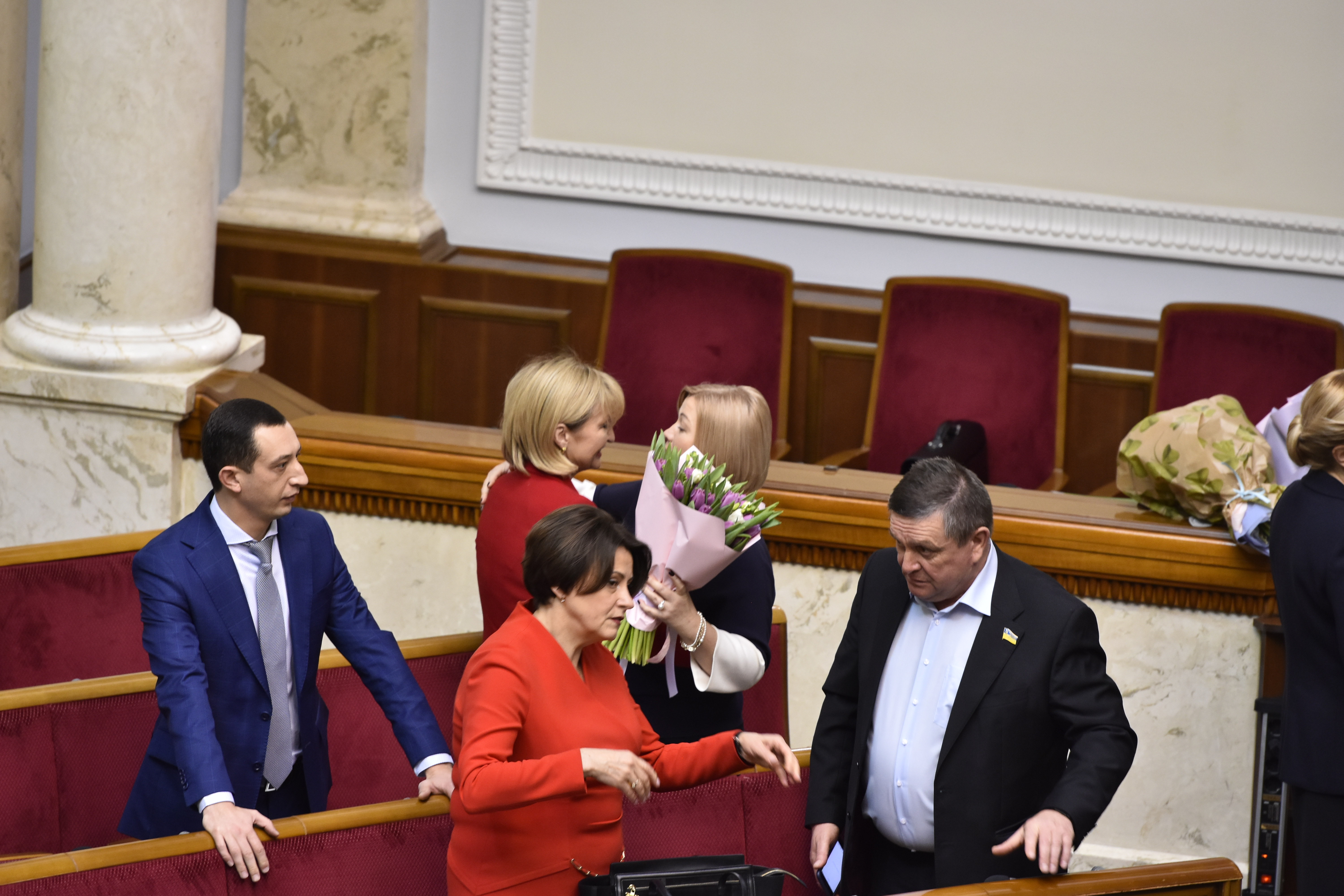 Традиционно, куму президента поздравляли коллеги по парламенту. Она получала букеты и подарки на рабочем месте в сессионном зале. Одной из первых Ирину поздравила подруга и вице-спикер Ирина Геращенко, подарив букет тюльпанов.