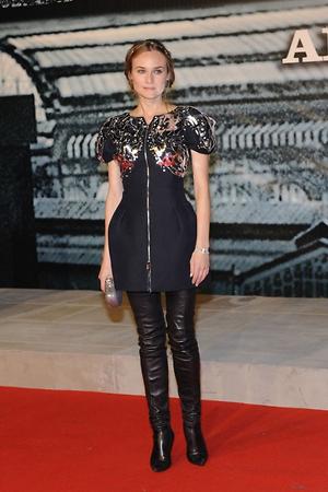 На берлинской премьере фильма "Шерлок Холмс" актриса Диана Крюгер была в наряде от Карла Лагерфельда. Она остановилась на коротком кожаном платье черного цвета. Лиф и рукава, отделанные серебром и с небольшими вкраплениями красного оттенка, придавали образу блондинки некий романический ореол.