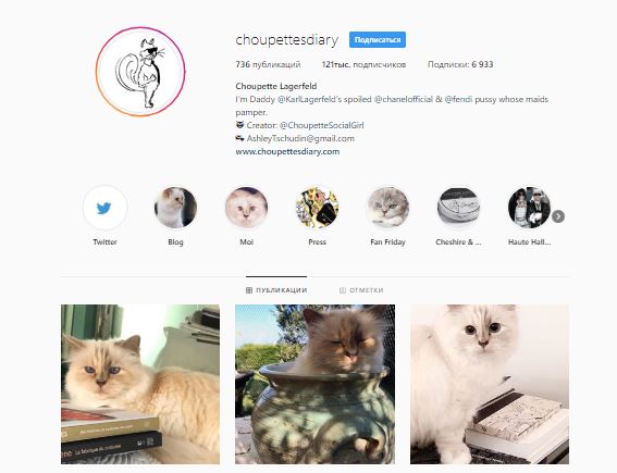 Это одна из самых известных кошек в мире моды. Ее хозяином был сам Карл Лагерфельд. У нее есть свои аккаунты в Twitter и Instagram (121 000 подписчиков), благодаря которым пользователи соцсетей следят за жизнью питомца.