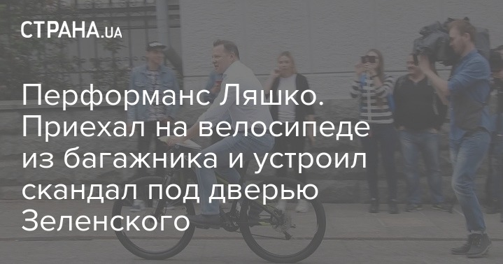 Для начала радикал в джинсах и рубахе приехал под здание Администрации президента на велосипеде. Видимо, хотел потроллить героя Василия Голобородько, которого сыграл Владимир Зеленский в сериале "Слуга народа". Голобородько ездил на велосипеде. Вот и Ляшко решил повторить его "путь".