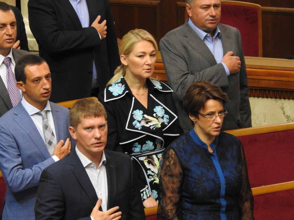 Нардеп Ионова (по середине) поет гимн в платье от Магдыч, фото: Изым Каумбаев, "Страна"