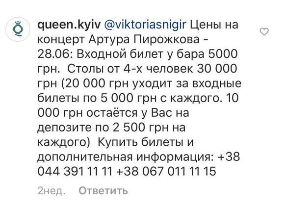 Что касается билетов, то на выступление "патриотичного парня" Реввы можно было попасть за 5000 гривен и постоять у бара, столик на четверых стоил 30 000 грн (депозит 10 000 на всех , остальное - цена билетов).