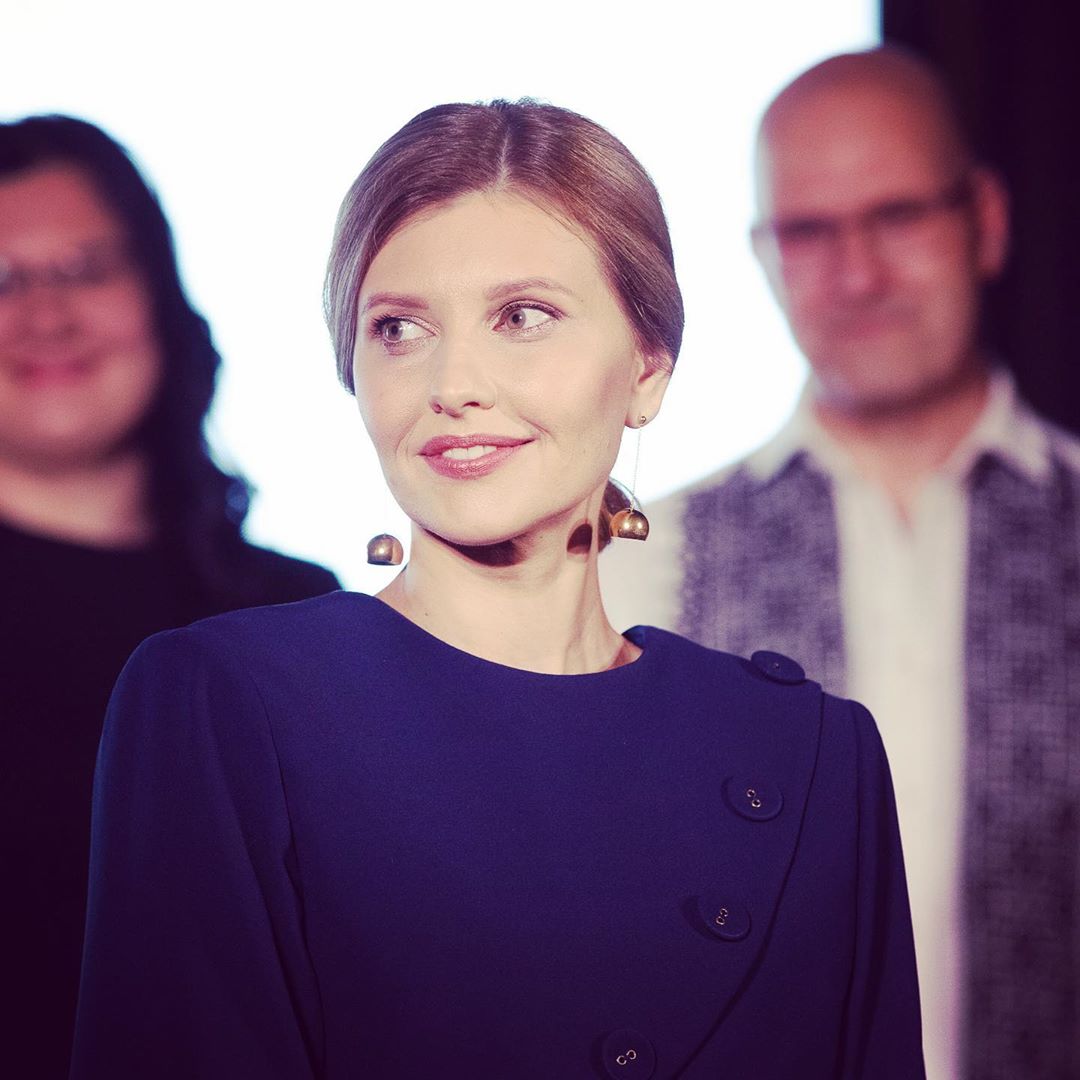 На сей раз Елена Зеленская появилась в синем костюме: топе и юбке-карандаше. Свой образ она дополнила длинными серьгами от украинского ювелирного бренда Guzema fine jewelry и собранными волосами.