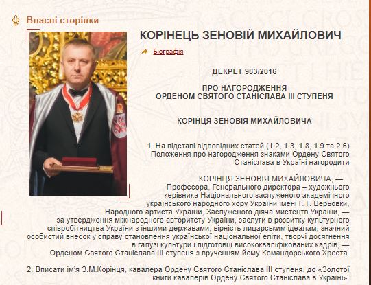 Зеновий Коринец - народный артист Украины и заслуженный деятель искусств. Также он награжден орденом Святого Станислава III степени с вручением ему командорского Креста.
