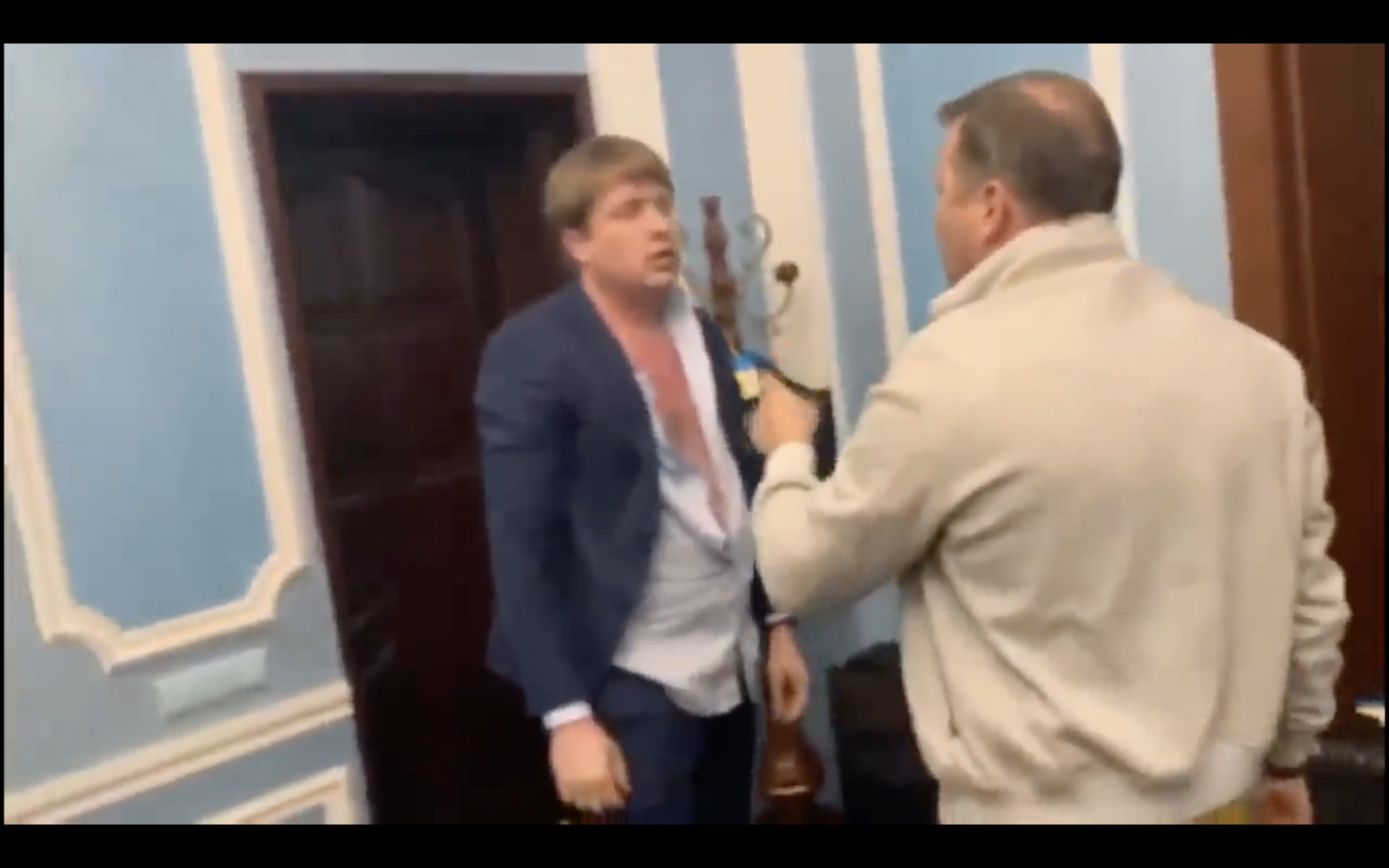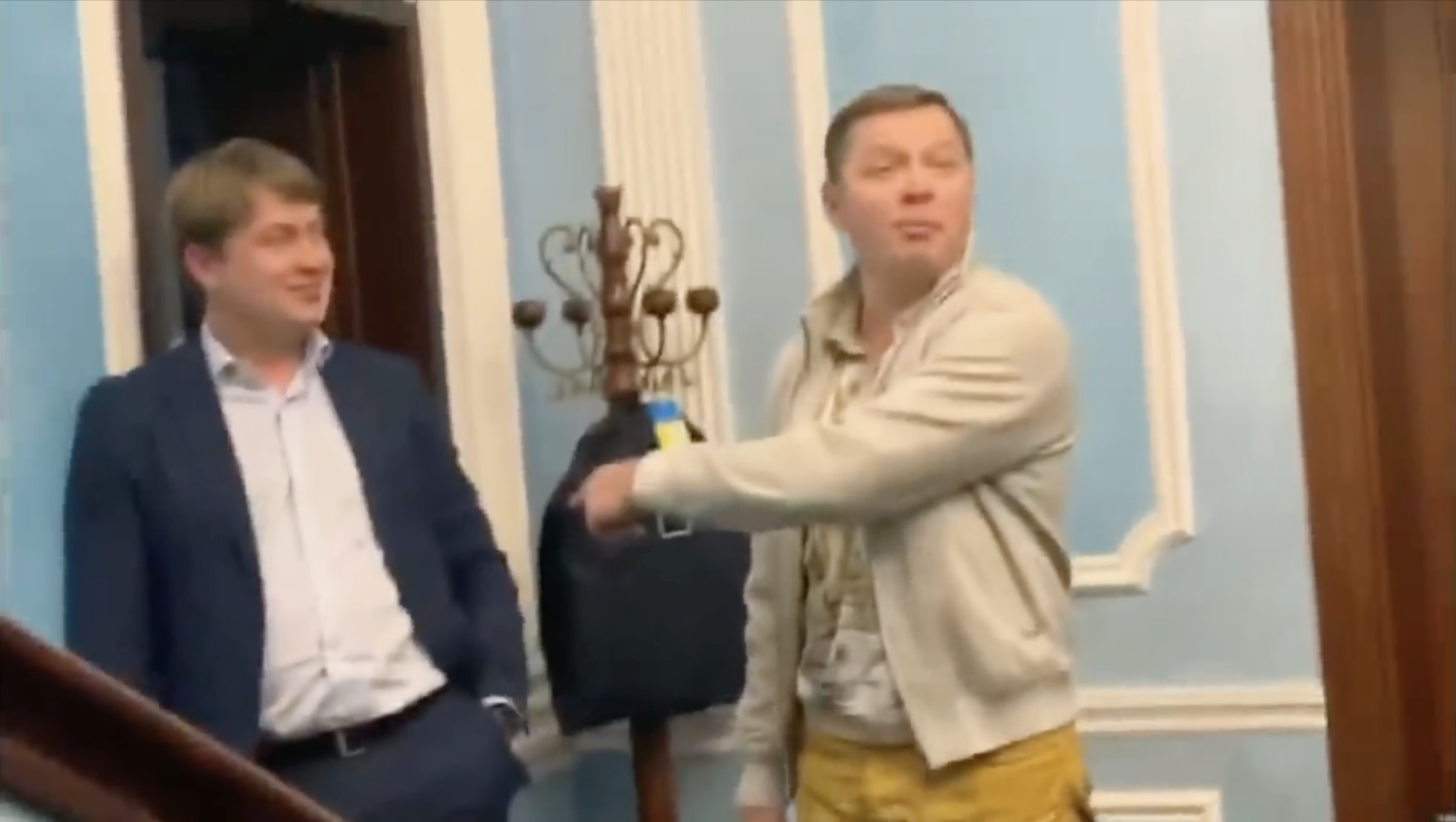 46-летний Олег Ляшко, лидер "Радиальной партии" напал на 37-летнего Андрея Геруса, депутата от "Слуги народа", главу комитета по вопросам энергетики и жилищно-коммунальных услуг. Видео инцидента вскоре появилась у Ляшко на странице в социальной сети Facebook.