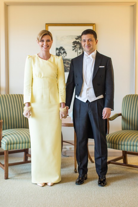 А еще в нарядах от Климчука госпожа Зеленская была на приемах в Соединенных штатах Америки. Для встречи с Дональдом Трампом и его супругой Меланией она выбрала темно-синее, почти черное платье с вышивкой и поясом.