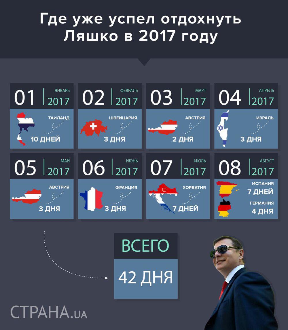 А тем временем, "Страна" подсчитала, сколько за восемь месяцев Ляшко отдыхал за границе. Оказалось, что 42 дня.