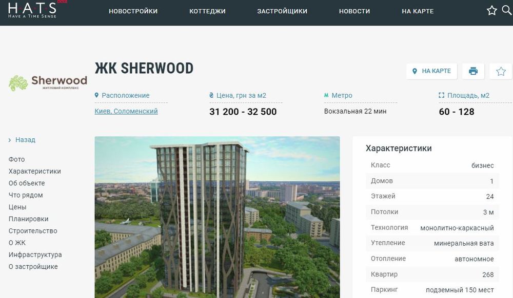 На сайтах по продаже недвижимости указано, что квадратный метр в жилом комплексе "Шервуд", который находится в Соломенском районе города Киева, стартует от 31 200 грн.
