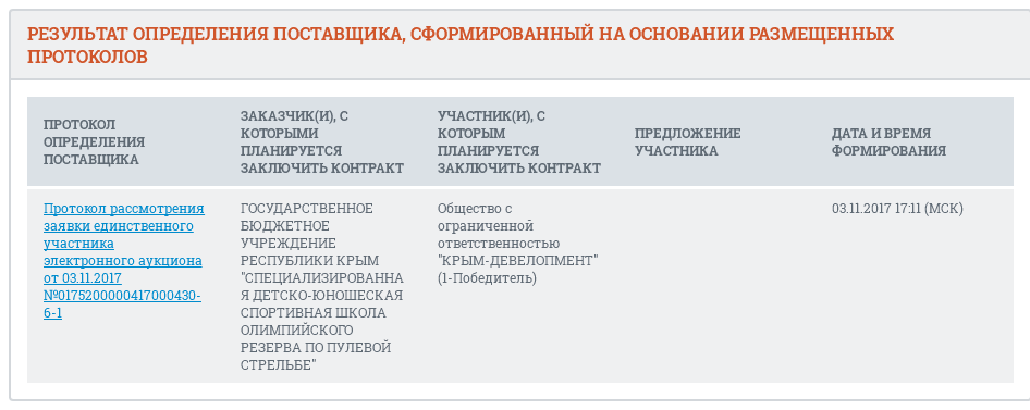 Действительно, на портале госзакупок РФ появилось объявление о том, что тендер на реконструкцию детско-юношеской спортивной школы олимпийского резерва в Крыму выиграла фирма "Крым-Девелопмент" из Симферополя. Стоимость контракта составила 112 млн рублей (около 50 миллионов гривен).