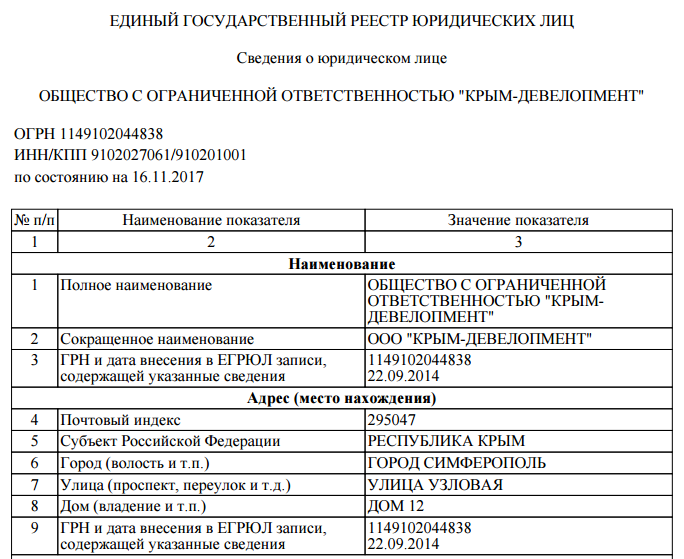 Согласно полученной нами выписке из реестра юридических лиц РФ, победитель крымских тендеров ООО "Крым-Девелопмент" было зарегистрировано 22 сентября 2014 года по адресу Симферополь, ул.Узловая, 12. Директором и учредителем фирмы в одном лице является Валерий Писарев: