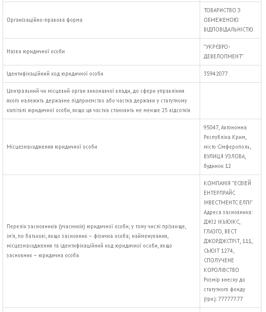 Как сейчас часто бывает в Крыму, у зарегистрированной по российским законам фирмы есть украинский "брат-близнец". Согласно украинскому реестру юридических лиц, ООО "УКРЕВРО-ДЕВЕЛОПМЕНТ" зарегистрировано в Симферополе по тому же адресу ул. Узловая, 12, а ее директором является тоже Валерий Писарев: