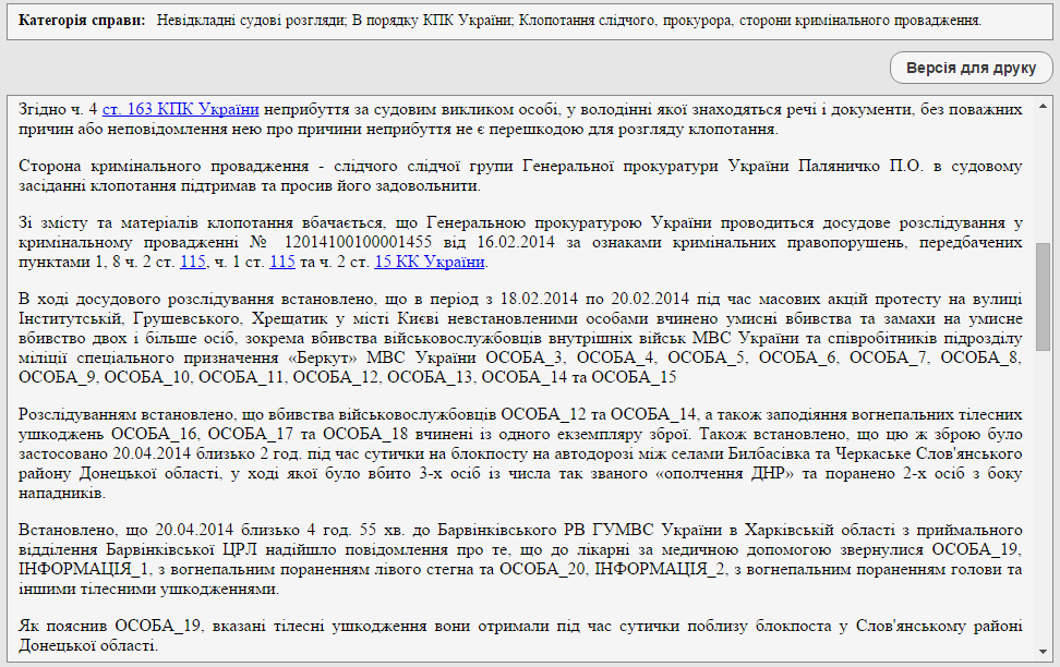 В Едином реестре судебных решений появилось постановление по уголовному делу № 12014100100001455 (ст. 115 и ст. 15 КК Украины – убийство и покушение на убийство). В рамках досудебного расследования этого дела было, в частности, установлено, что 13 служащих МВД погибли или были ранены на Майдане 18-20 февраля 2014 года от пуль, выпущенных из оружия, которое применялось во время нашумевшего нападения на блокпост ДНР под Славянском 20 апреля 2014 года.