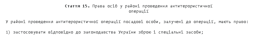 Дело в том, что АТО на Донбассе была начата и ведется в соответствии с законом "О борьбе с терроризмом". А по статье 15 этого закона применять оружие и специальные средства при АТО можно только в соответствии с законодательством: