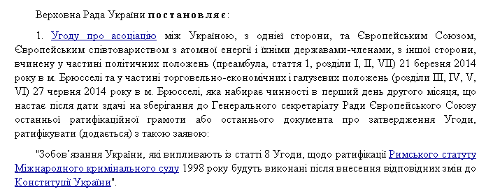 Кроме того, в законе о ратификации Соглашения об ассоциации с ЕС прямо указано, что Верховная Рада обязана ратифицировать Римский статут Международного уголовного суда после внесения изменений в Конституцию Украины: