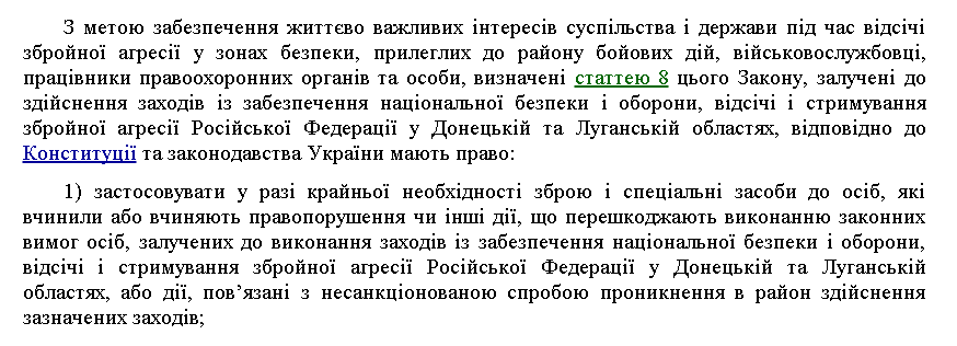 В новом законе "о реинтеграции Донбасса", о котором уже рассказывала "Страна", тоже осталось требование применять оружие только "в соответствии с законодательством". Согласно статье 12, ВСУ получили право стрелять, согласно Конституции и законодательству, только в случае "крайней необходимости":