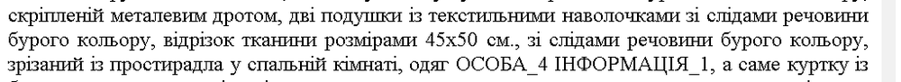 Но в реестре судебных решений имеется определение суда, в котором сообщается, что в квартире, где произошло двойное убийство, были найдены две подушки и оторванная часть простыни с "веществом бурого цвета". Под таким веществом обычно подразумевают запекшуюся кровь. Наличие следов крови не соответствует распространенной в СМИ версии полиции, согласно которой обе жертвы были задушены: