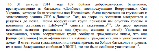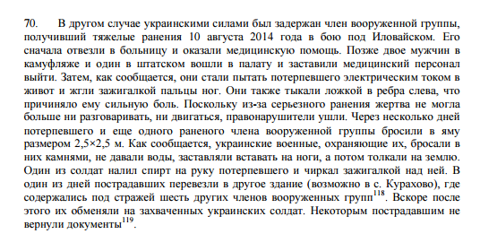 Большое внимание в докладе ООН уделено судьбе украинских солдат, захваченных во время отступления из Иловайска. По данным Генеральной прокуратуры, тогда были захвачены около 300 украинских солдат, большинство – 29 и 30 августа. До 10 солдат были захвачены в начале сентября, когда их обнаружили в близлежащих полях.