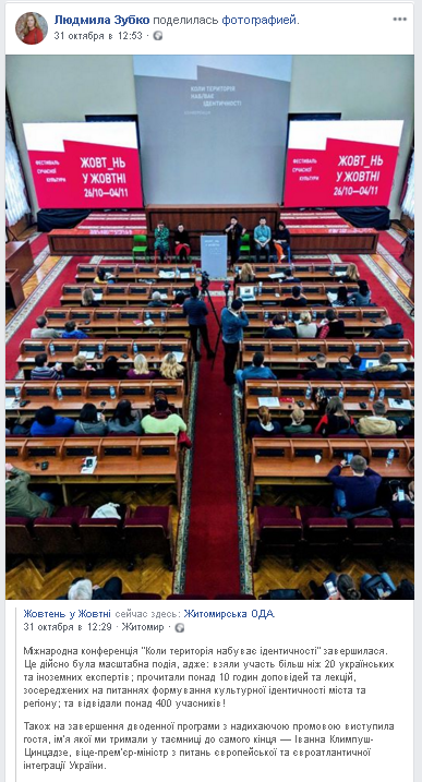 О проведении в Житомире фестиваля "Октябрь в Октябре" Людмила Зубко сама поделилась сообщением в Facebook: "Международная конференция "Когда территория приобретает идентичность" завершилась. Это действительно была масштабное событие, ведь: приняли участие более 20 украинских и зарубежных экспертов; прочитали более 10 часов докладов и лекций, сосредоточенных на вопросах формирования культурной идентичности города и региона; и посетили более 400 участников":