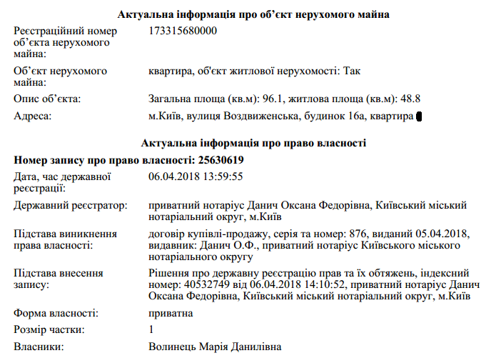 Раньше на дочек Волынца и Маркаровой Анну и Марию была также записана приобретенная в 2007 году 123-метровая квартира в Киеве. Ее Оксана Маркарова задекларировала в 2017 году: