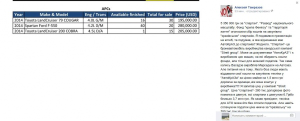 По утверждениям Тамразова волонтеры пытались купить автомобили не напрямую в США, а у украинского "АвтоКрАЗа". Тамразов сделал запрос канадской компании Streit Group, производительнице автомобилей Spartan Ford F-550. Согласно ответу компании, скриншот которого Тамразов выложил на своей странице, цена на "Спартан" у производителя - 280 тысяч долларов, то есть, около 3,7 миллиона гривен. Волонтёры же собирали на автомобиль 5,35 миллиона гривен. "Кому война, а кому мать родна? К сожалению, в эту историю могут вляпаться фонды, которые не совсем в теме", - сетовал автогонщик: