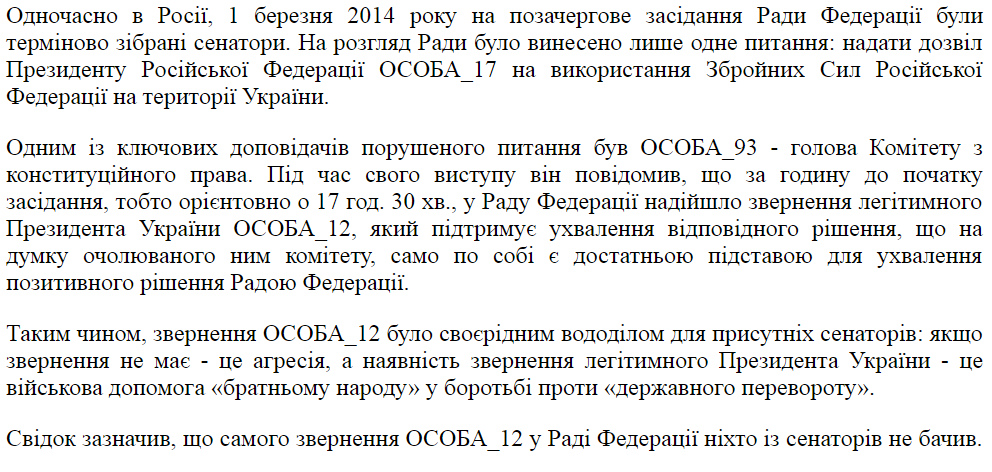 Дальше суд в приговоре утверждает, что заявление Януковича было использовано как одно из оснований обращения Президента РФ к Совету Федерации о предоставлении согласия на использование Вооруженных Сил РФ на территории Украины, и для принятия такого решения верхней палатой парламента РФ.
