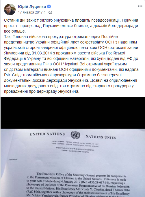 Несмотря на наличие документа на сайте ООН, украинские правоохранители три года не давали ему ход. Только в начале января 2017 года Генеральная военная прокуратура сделала письменный запрос в секретариат Объединенных наций. В ответ прокуроры получили заверенную копию заявления Януковича. Об этом генпрокурор Юрий Луценко 17 января 2017 года сообщил в своем Facebook: