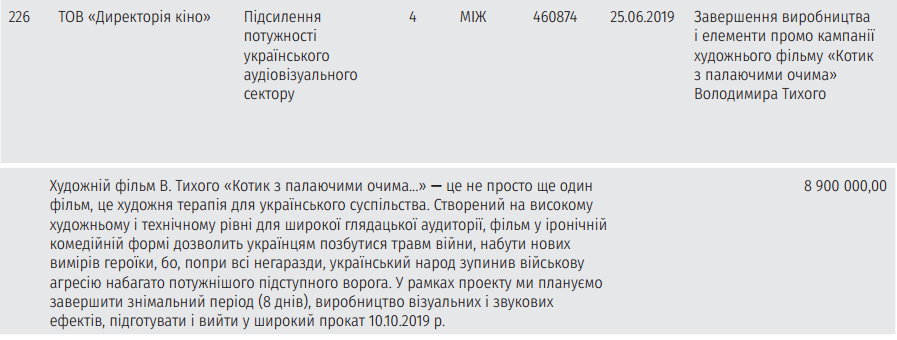 На третьем месте по объему средств, потраченных УКФ под руководством Марины Порошенко - транш на сумму 8,9 млн грн., выделенный на завершение производства художественного фильма "Котик с горящими глазами" режиссера Владимира Тихого.