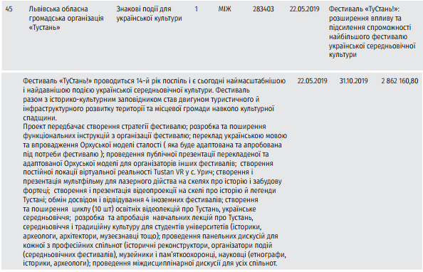 Из числа львовских получателей грантов наибольшую сумму 2,8 млн получит фестиваль средневековой культуры "Тустань". Его проводит одноименная общественная организация: