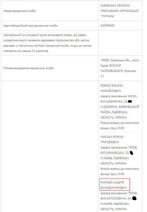 Согласно данным реестра юридических лиц, одним из трех учредителей организации "Тустань", которой будут даваться деньги, является Андрей Парубий - нынешний спикер Верховной Рады:
