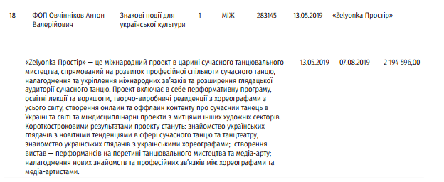 Почти 2,2  млн. получил предприниматель Антон Овчинников на танцевально-хореографический проект "Zelyonka Простір":