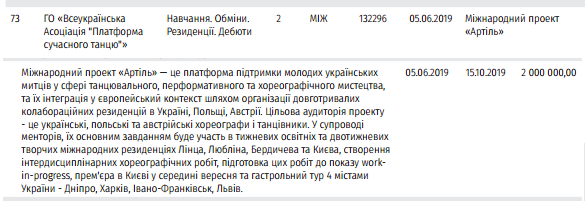 Еще на один проект "Артель", на ту же танцевальную тему, 2 млн грн должна получить общественная организация "Платформа современного танца":