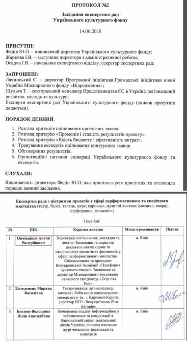 Но это еще не все. Как оказалось, Антон Овчинников имеет непосредственное отношение к самому УКФ. В июне 2018 года он стал постоянным экспертом фонда как раз в сфере сценического искусства, куда относятся балет, танцы и другие смежные виды искусства. Это сообщается в протоколе заседания экспертных советов УКФ: