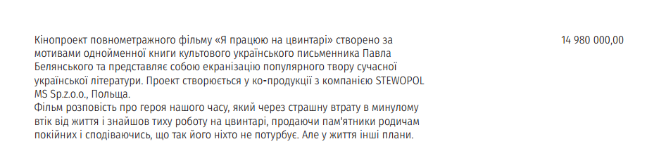 Наибольшую сумму (почти 15 миллионов) от фонда под руководством Марины Порошенко получит фильм "Я работаю на кладбище". Фильм снимается по сценарию автора одноименной книги Павла Белянского: