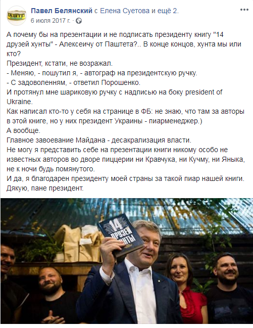 Выпуск книги "14 друзей хунты" в 2017 году поддержал Петр Порошенко, за что Павел Белянский его благодарил со словами "Дякую, пане президент":