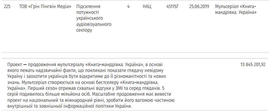 Второй по размеру транш от фонда под управлением Марины Порошенко получат создатели мультсериала "Книжка-путешествие. Украина" (укр. "Книга-мандрівка. Україна"). Они получат почти 14 млн грн:
