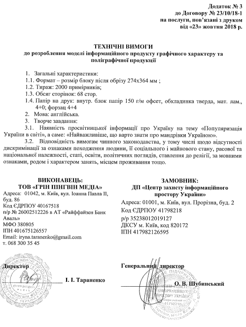 На самом деле, "Грин Пингвин Медиа" получило 700 тысяч гривен за 2 тысячи экземпляров книжки на английском языке о путешествиях по Украине. Это сообщено в техническом задании, которое являлось приложением к подписанному договору: