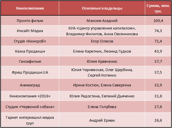 Крупнейшим получателем бюджетных средств от Госкино стало ООО "Пронто фильм". Начиная с 2017 года, эта фирма получила больше 100 миллионов гривен на производство фильмов, в основном, патриотического содержания.