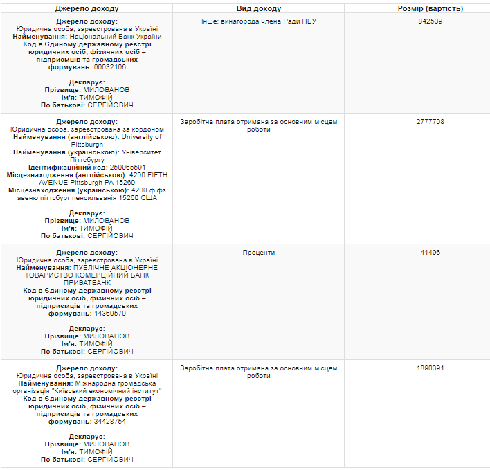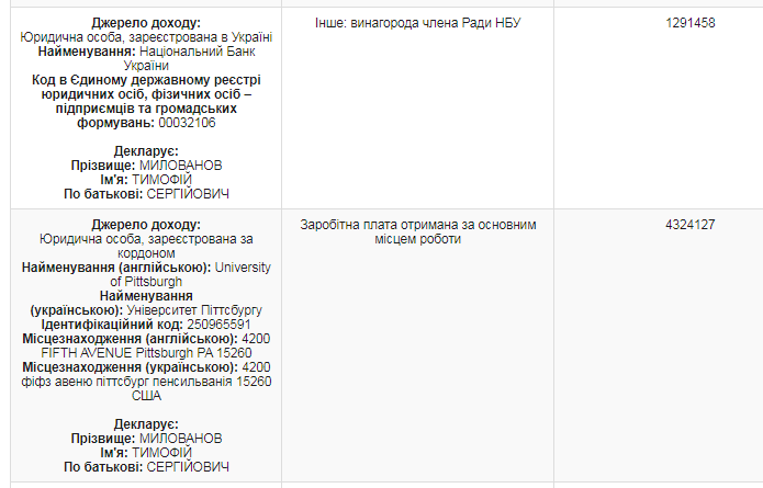 Так, в декларации за 2018 год Милованов сообщил, что получил за год 4,3 млн грн. (около $160 тысяч) в качестве зарплаты от университета Питтсбурга в США, и еще почти 1,3 млн грн. в качестве вознаграждения как член Совета Нацбанка: