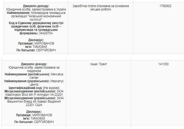 Также Милованов в 2018 году получил грант в размере 141 тысяч гривен от американской исследовательской организации "Меркатус центр":