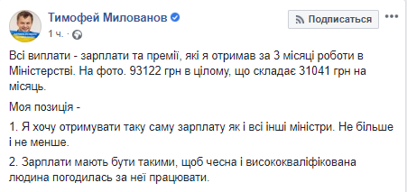 Как сообщала "Страна", министр Милованов показал, сколько на самом деле получает в министерстве. Об этом он сообщил на своей странице в Facebook.