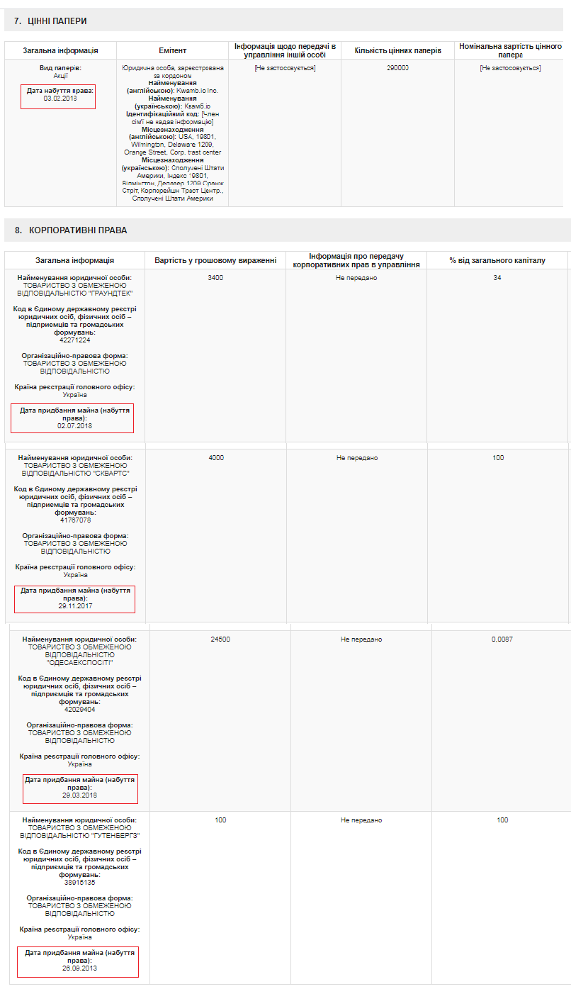Также Владимир Усов в декларации за 2018 год не задекларировал наличие у него акций американской компании Kwamb.io Inc., а также долей в 4 украинских фирмах. В декларации за 2019 год эти активы он указал, и также сообщил, что они были в его собственности в 2018 году или даже раньше. Например, уже упомянутая ООО "Гутенбергз" (которая фигурирует в уголовном производстве о продаже бесплатных учебников) была в собственности Владимира Усова еще с 2013 года. Еще одной фирмой (ООО "Сквартс") Усов владел с 2017 года. То есть, в декларации за 2018 год он в любом случае должен был их указать: