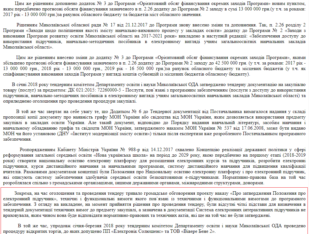 Суть дела такова. В конце 2016 года в Николаевской области была утверждена Программа развития образования на 2017-2021 годы. В ней, среди прочего, было предусмотрено обеспечение доступа учеников к электронным версиям учебников. Под эту программу было предусмотрено финансирование на десятки миллионов гривен.
