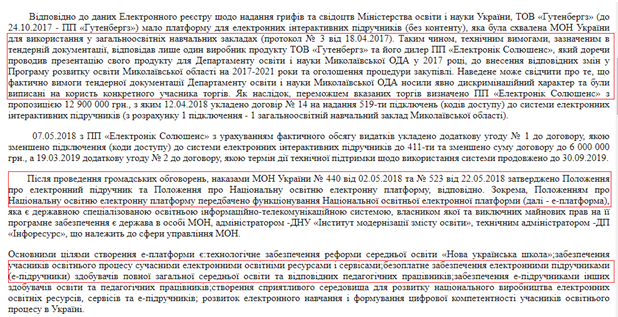 В результате с последним в апреле 2018 года был заключен договор на 519 подключений (кодов доступа) к системе электронных интерактивных учебников (из расчета 1 подключение на 1 общеобразовательное учебное заведение Николаевской области). Сумма договора составила 12,9 миллионов гривен.