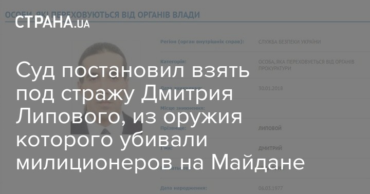 Печерский суд столицы решил арестовать харьковчанина Дмитрия Липового - владельца оружия, из которого на Майдане 20 февраля 2014 года расстреливали милиционеров. Соответствующее определение суда было принято 31 марта.