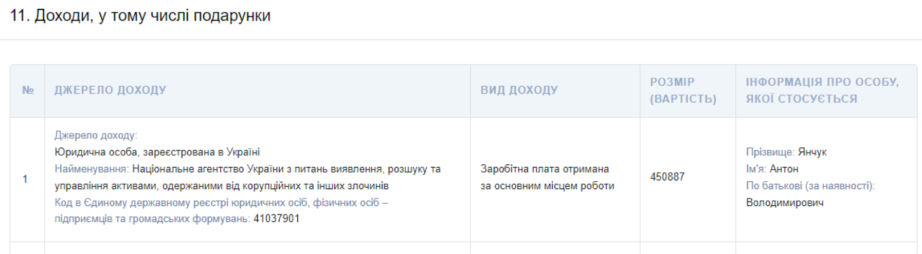 Согласно декларации Антона Янчука, в 2020 году, уже после увольнения с должности главы АРМА и пребывая за штатом, он получил зарплату на сумму 450 тыс грн: