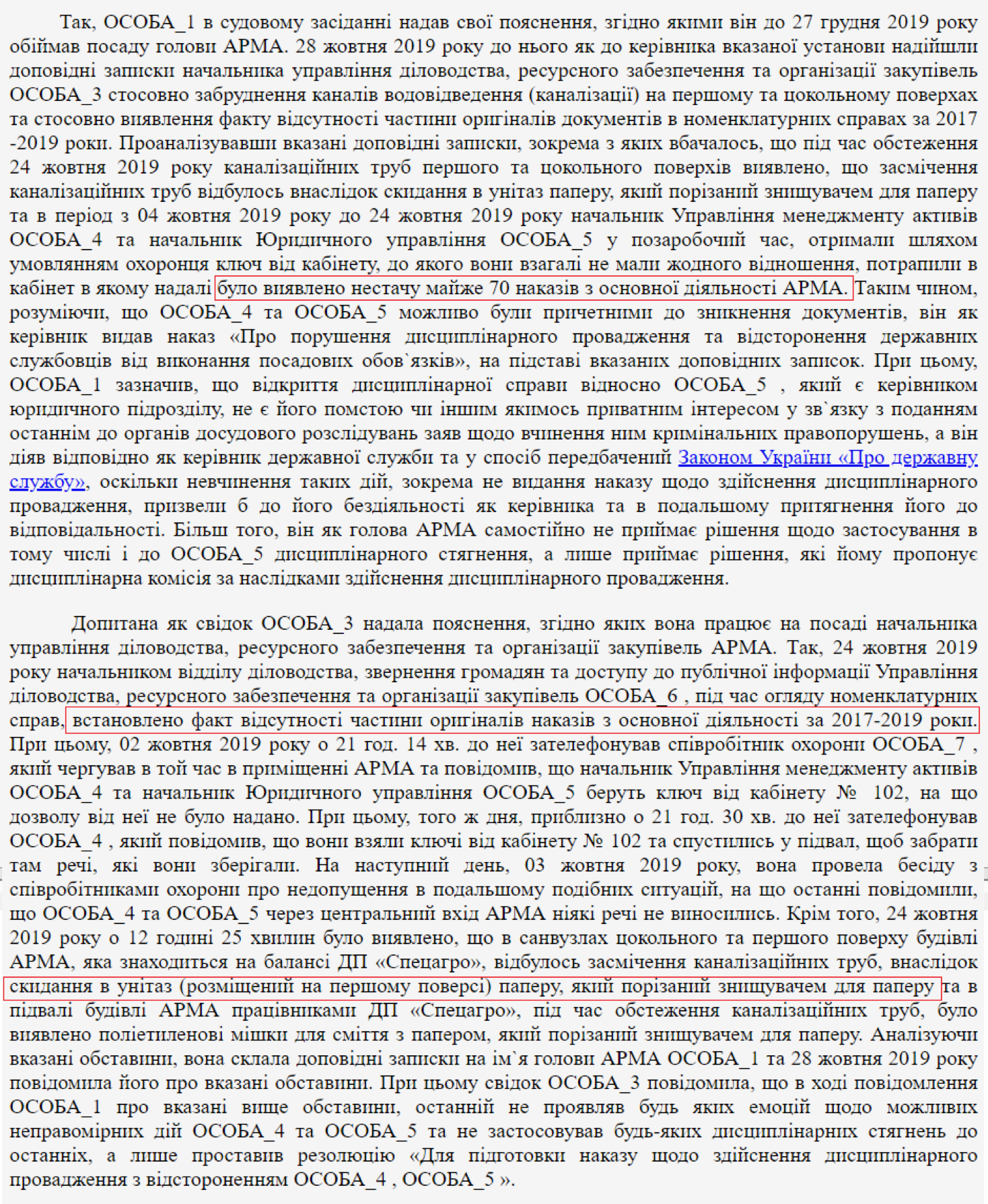 Как говорится в одном из постановлений Шевченковского райсуда Киева, глава АРМА Антон Янчук дал суду показания, что 28 октября 2019 года ему поступили докладные записки начальника управления делопроизводства относительно загрязнения каналов водоотвода (канализации) на первом и цокольном этажах здания агентства. Также было выявлено отсутствие части оригиналов документов за 2019 год.