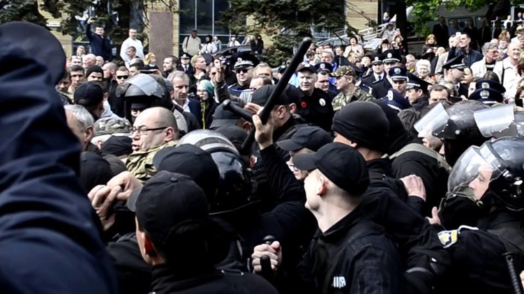Иная ситуация наблюдается по столичному инциденту, где правоохранители также применяли силу в отношении активистов ОУН (читай также ветеранов АТО). Напомним, что 9 мая группа активистов националистической организации ОУН развернула флаги на доме по улице Мазепы, и во время прохождения мимо их окон "Бессмертного полка" в участников шествия были запущены яйца, картошка, шарики с краской и дымовые шашки.